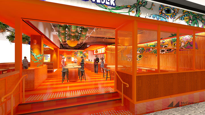 Our concept? An orange “tractor beam” of good times. Everything below the 'high tide' mark? Orange. Paint, tiles, textures...unless it’s a mural. That’s where street artist Brent Smith (AKA Biffy Brentano) came in, adding colourful flair.